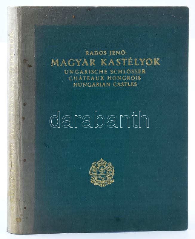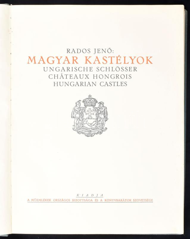 Rados Jenő: Magyar kastélyok. Ungarische Schlösser. Châteaux hongrois. Hungarian Castles. Bp., 1931, Műemlékek Országos Bizottsága - Könyvbarátok Szövetsége (Kir. M. Egyetemi Nyomda), 238+(1) p. A 21-211 oldalak között fekete-fehér fotókkal, valamint szövegközi illusztrációkkal. Kiadói aranyozott egészvászon-kötés, kopott borítóval.