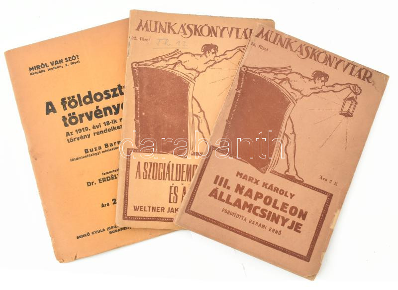 3 db 1919. évi kiadvány: Marx Károly: III. Napoleon államcsinyje. Ford.: Garami Ernő. + Weltner Jakab: A szociáldemokrata párt és a béke. Munkáskönyvtár 14. és 22. füzet. Bp., 1919, Népszava. + Dr. Erdély Jenő: A földosztás törvénye. Az 1919. évi 18-ik néptörvény rendelkezései. Buza Barna földmivelésügyi miniszter előszavával. Bp., 1919, Benkő Gyula. Kiadói papírkötés, változó állapotban.