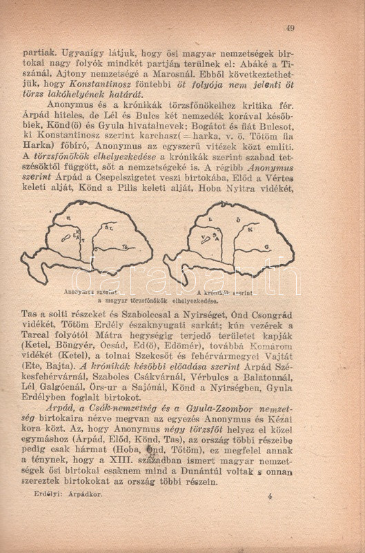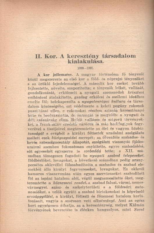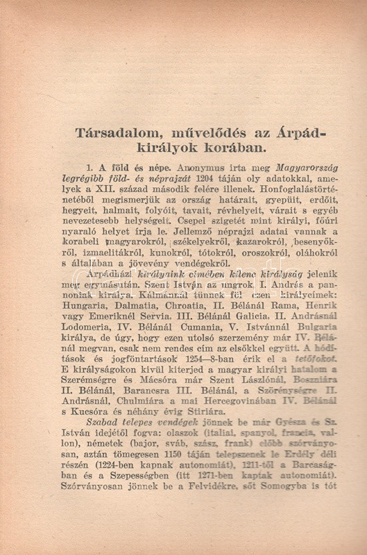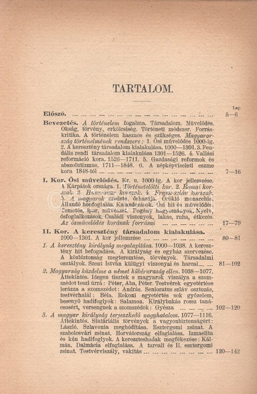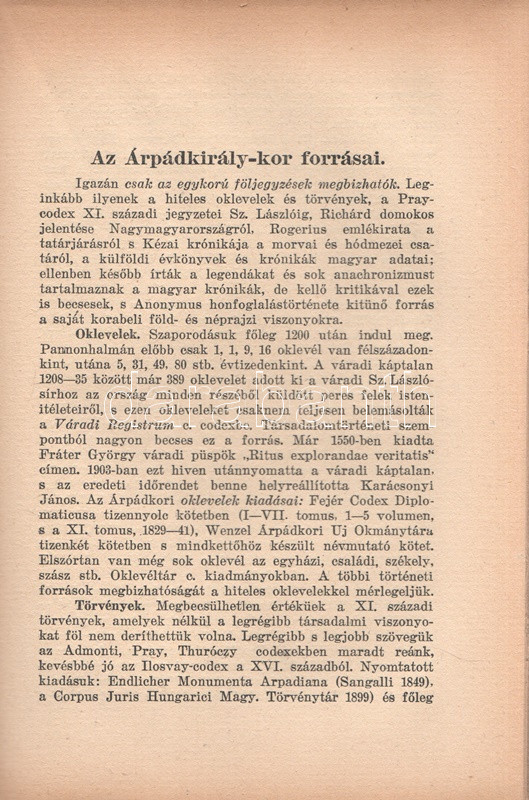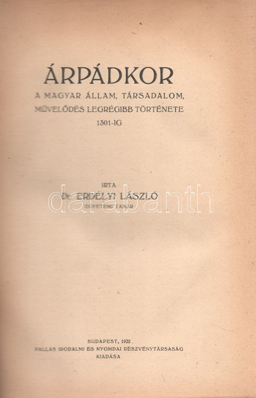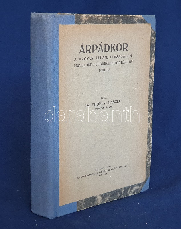 Erdélyi László: Árpádkor. A magyar állam, társadalom, művelődés legrégibb története 1301-ig. Budapest, 1922. Pallas Irodalmi és Nyomdai Rt. 347 + [1] p. Első kiadás. Erdélyi László (1868-1947) bencés tanár, művelődéstörténész társadalomtörténeti munkája a korabeli katolikus sajtóban erős kritikát kapott (Katolikus Szemle, 1923, 180-182. p.). Későbbi félvászon kötésben, az eredeti első borítófedél az első kötéstáblára ragasztva. Jó példány.