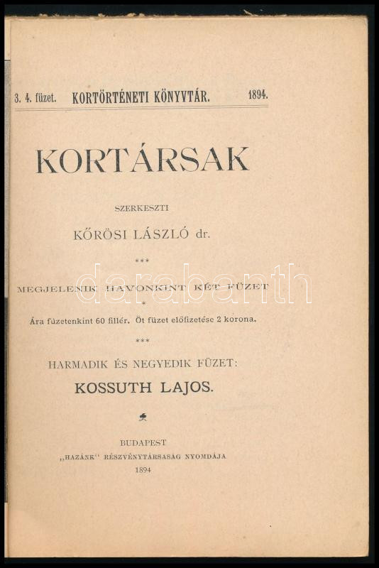 Kossuth Lajos. Kortársak 3-4. füzet. Szerk.: Kőrös László. Kortörténeti Könyvtár. Bp., 1894, "Hazánk"-ny., 175+(1) p. Kiadói illusztrált papírkötés, sérült, kissé foltos borítóval, belül a lapok jó állapotban.
