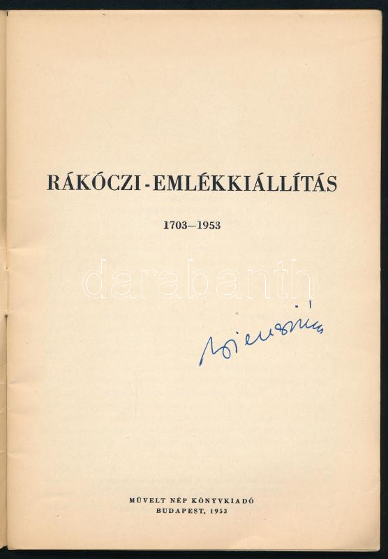 Rákóczi-emlékkiállítás 1703-1953. (Dienes István által aláírt). Bp., 1953, Művelt Nép, 42 p.+ 1 t. Fekete-fehér képekkel illusztrálva. Kiadói tűzött papírkötés. Megjelent 3000 példányban. A címlapon Dienes István (1929-1995) régész, muzeológus saját kezű aláírásával.
