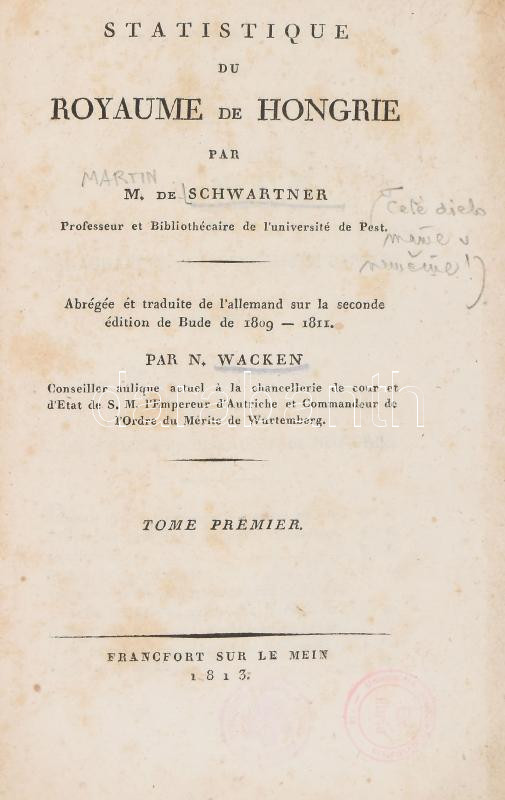 Schwartner, Martin: Statistique du Royaume de Hongrie. Abrégée et traduite de l'allemand sur la seconde édition de Bude de 1809 - 1811. Par N. Wacken. I. (két kötetben teljes) Francfort Sur Le Mein, 1813, 314p. Korabeli papírborítóval, felvágatlan