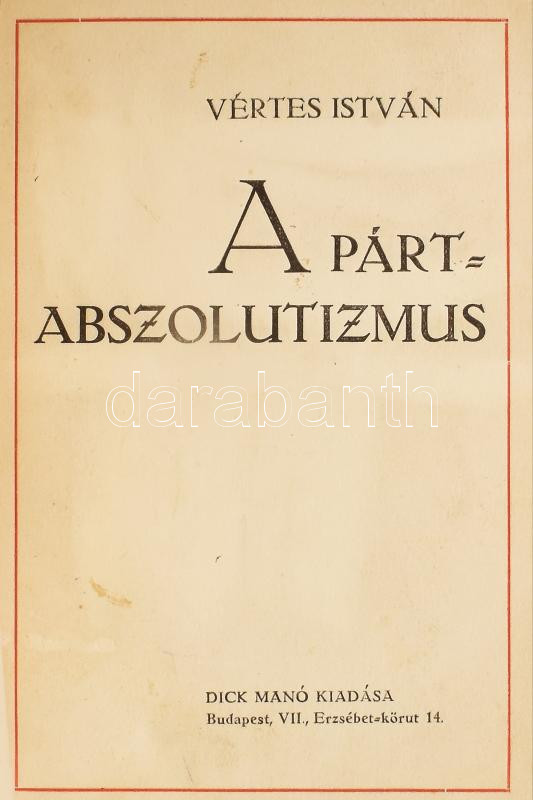 Vértes István: A párt-abszolutizmus. Bp., é.n. [1917?], Dick Manó, 157+(3) p. Átkötött félvászon-kötésben, az eredeti elülső papírborító bekötve, egy lapon kisebb lapszéli hiánnyal.