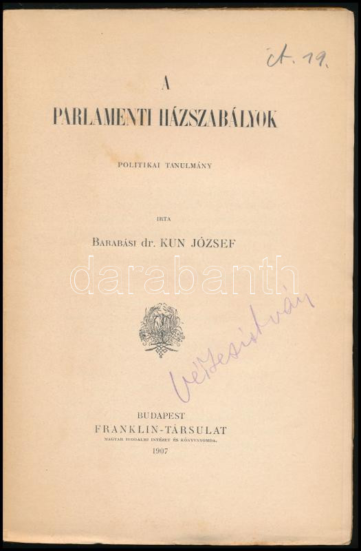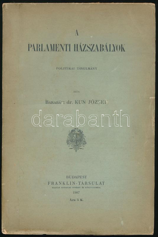 Kun József: A parlamenti házszabályok. Politikai tanulmány. Bp., 1907, Franklin-Társulat, 259+(4) p. Kiadói papírkötés, kissé sérült borítóval, sérült gerinccel, helyenként kissé sérült lapszélekkel.