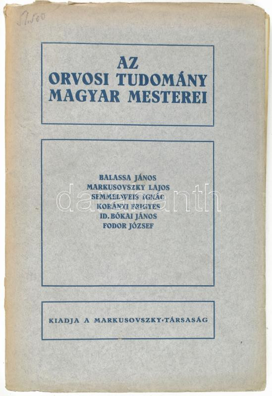 Az orvosi tudomány magyar mesterei. Balassa János, Markuszovszky Lajos, Semmelweis Ignác, Korányi Frigyes, Id. Bókai János, Fodor József. Bp., 1928., Markusovszky-Társaság,(Magyar Tudományos Társulatok Sajtóvállalata-ny.) Kiadói papírkötés, laza, sérült kötéssel, kissé szakadozott borítószélekkel. Dr. Heckenast Gusztáv orvos (nem a történész) névbélyegzésével.