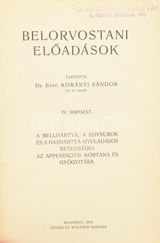Korányi Sándor: Belorvostani előadások. I-IV. sor. Bp., 1910 - 1912., Singer és Wolfner, 192 p.; 254 p.; 222 p.; 226 p. Átkötött egészvászon-kötések, kissé kopott borítókkal, a II. kötet kopott borítóval, az I. kötet hátsó tábláján a papírborítás sérült.