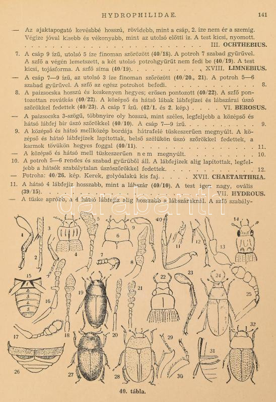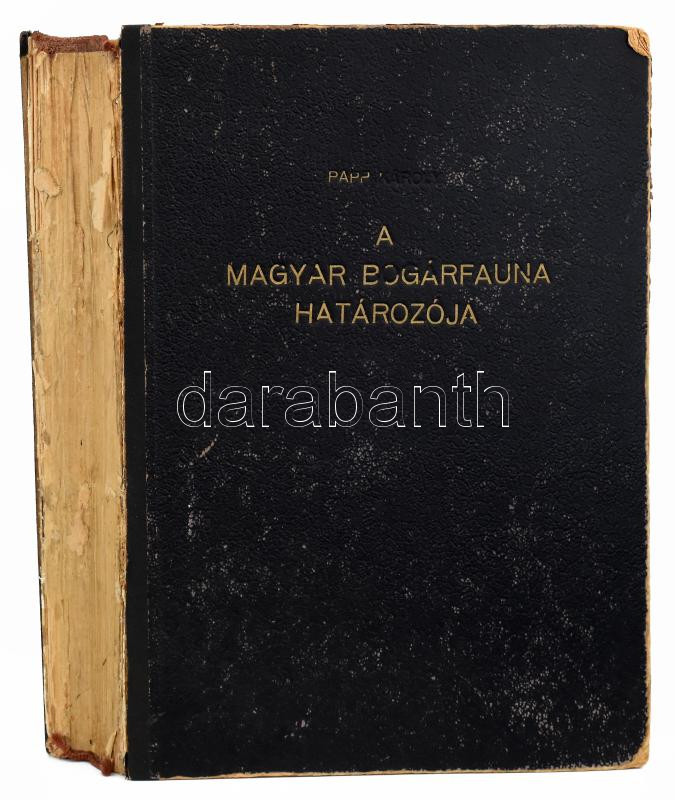 Papp Károly: A magyar bogárfauna határozója. Kézikönyv a történelmi Magyarország területén előforduló jellegzetes bogarak meghatározására. Valamennyi középiskolai, mezőgazdasági szakiskolai, valamint akadémiai, főiskolai és egyetemi használatra. Műnyomólapon, valamint a szöveg között 3.000 bogár és bogártestrész rajzával. Bp., 1943., Ruszkabányai, 1 t. +477+3 p.+1 t. Kiadói félvászon-kötés, sérült, hiányzó gerinccel, kopott borítóval.