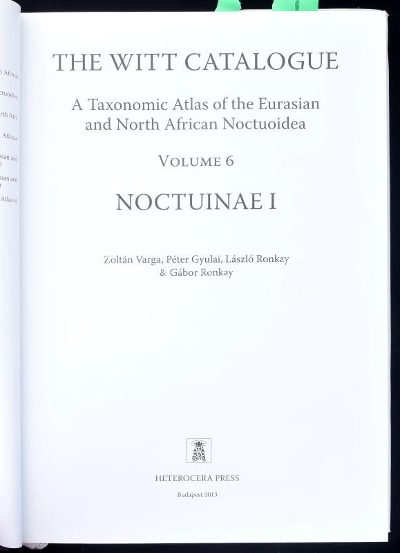 The Witt Catalogue. A Taxonomic Atlas of the Eurasian and North African Noctuoidea. Volume 6: Noctuinae I. Főszerk.: Thomas J. Witt. Zoltán Varga, Péter Gyulai, László Ronkay, Gábor Ronkay. Bp., 2013, Heterocera Press. Angol nyelven. Nagyon gazdag képanyaggal illusztrált. Kiadói egészvászon-kötés, kiadói papír védőborítóban, a papír védőborítón kis szakadással, a vászonborítón kis kopásnyommal.