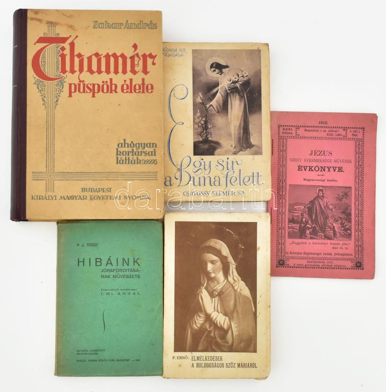 5 db vallási témájú könyv: P. Tissot József: Hibáink jórafordÃtásának művészete. Ford.: Uhl Antal. Bp., 1931, Korda Rt. Kiadói papÃrkötés, kissé foltos borÃtóval, helyenként kissé foltos lapokkal. + Jézus szent gyermeksége művének évkönyve. Magyarországi kiadás. Esztergom, 1910, Szent Gyermekség Műve. Kiadói tűzött papÃrkötés, sérült borÃtóval. + P. ErnÅ‘: Elmélkedések a Boldogságos Szűz Máriáról. Keszthely, 1936, Magyar Kármelita Rendtartomány. Kiadói papÃrkötés, kissé sérült, foltos borÃtóval. + P. Csávossy Elemér: Egy sÃr a Duna fölött. Bp., 1939, Korda Rt. Kiadói papÃrkötés, kissé sérült, foltos, a fűzéstÅ‘l részben elváló borÃtóval. + Zakar András: Tihamér püspök élete ahogyan kortársai látták. Bp., 1941, Kir. M. Egyetemi Nyomda. Kiadói félvászon-kötés, kissé foltos borÃtóval.