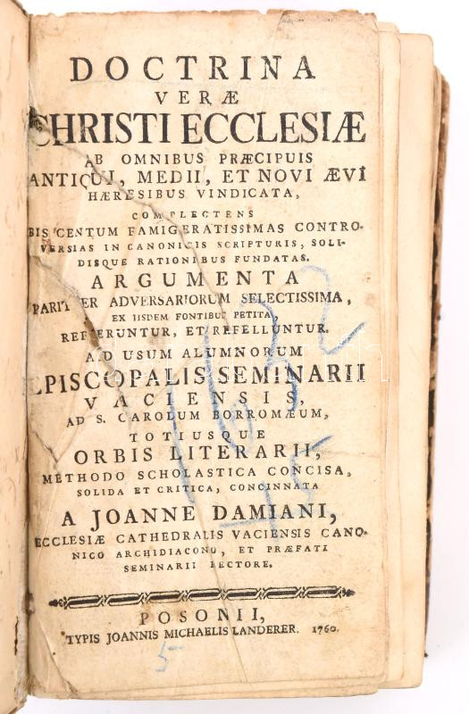 Damianus, Johannes: Doctrina verae Christi ecclesiae ab omnibus praecipuis antiqui, medii, et novi aevi haeresibus vindicata complectens bis centum famigeratissimas controversias in canonicis scripturis, solidisque rationibus fundatas. Argumenta pariter adversariorum selectissima ex iisdom fontibus petita, referuntur et refelluntur. Ad usum alumnorum episcopalis seminarii Vaciensis, totiusque orbis literarii, methodo scholastico concisa, solida et critica, concinnata. Posonii, 1760, Typis Joannis Michaelis Landerer, 14 sztl. lev. + 739+5 p. Damiani János (1710-1784) pozsonyi, később váci kanonok. Althann Mihály Károly váci püspök helyettese, a papnevelőintézeti igazgatója. Latin nyelven. Korabeli félbőr-kötésben, kopott borítóval, sérült táblákkal, firkált, sérült címlappal, foltos lapokkal, possessori bejegyzéssel.