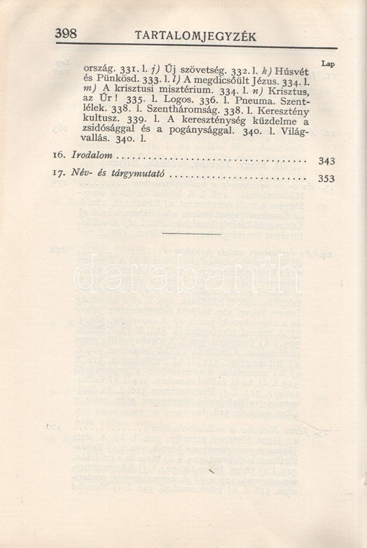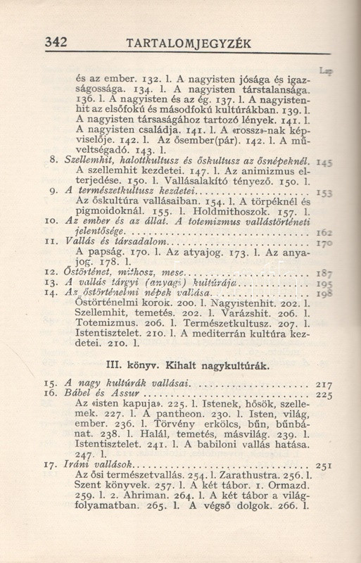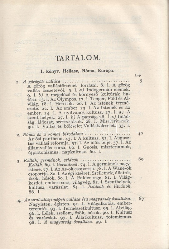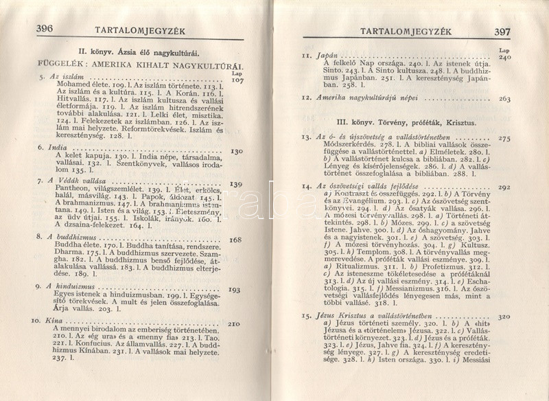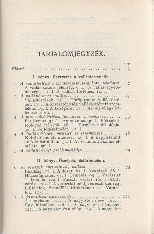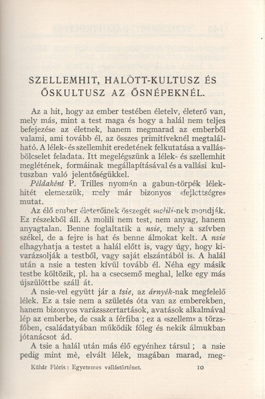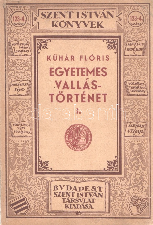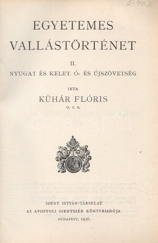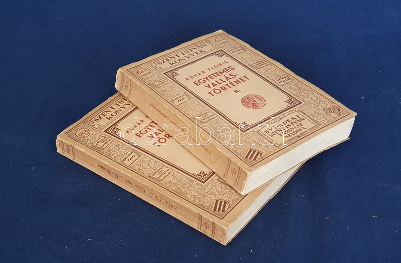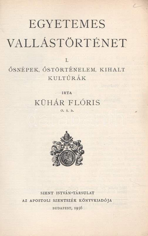 Kühár Flóris: Egyetemes vallástörténet. I. Ősnépek, őstörténelem, kihalt kultúrák. II. Nyugat és kelet. Ó- és Újszövetség. I-II. kötet. Budapest, 1936. Szent István-Társulat (Stephaneum nyomda rt.) 343 + [5] p.; 400 + [4] p. Első kiadás. Kühár Flóris (1893-1943) bencés szerzetes, vallástörténész, egyetemi tanár antropológiai ihletésű vallástörténeti monográfiája sok szempontból Wilhelm Schmidt (1868-1954) német-osztrák nyelvész, antropológus és római katolikus pap gondolatmenetét követi, főként abban, hogy az emberiség vallási elképezéseit ősi, egyistenhívő formára vezeti vissza, valamint abban, hogy az elmúlt évszázad régészeti és néprajzi eredményeit a legmesszebbmenőkig figyelembe veszi vallástörténete kidolgozásánál. Kühár Flóris dolgozata az elméleti bevezető után a természeti népek rítusait vizsgálja, majd a babiloni, perzsa, föníciai, egyiptomi vallások történetét nyomozza, a második kötetben pedig a görög, római, germán, kelta, szláv, urál-altáji népek vallástörténete után az iszlám, a buddhizmus és a hinduizmus, a konfucianizmus, a sinto vallások vizsgálata következik. Függelékben szerepel a judaizmus és a kereszténység vallástörténete. (Szent István könyvek 123-126.) Fűzve, egységes, feliratozott kiadói borítóban. Szép példány.