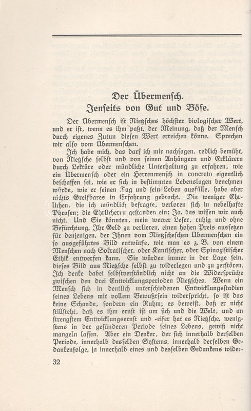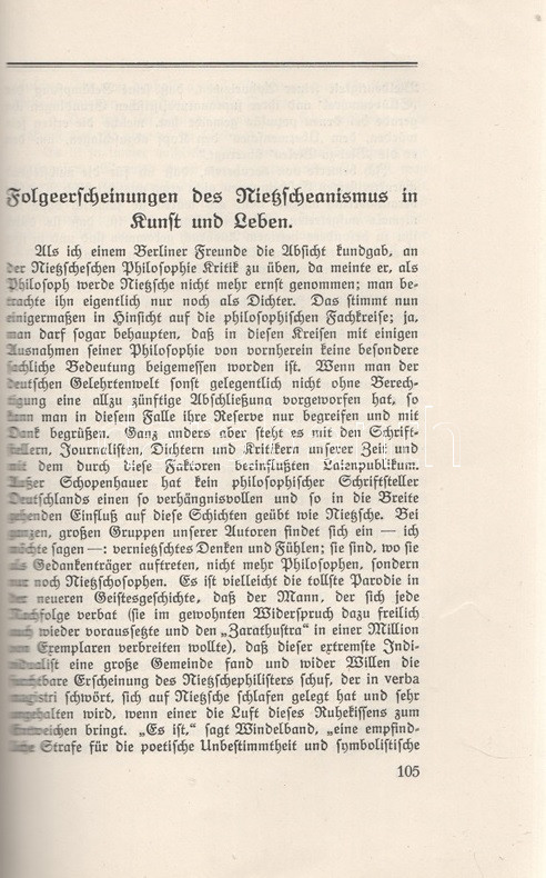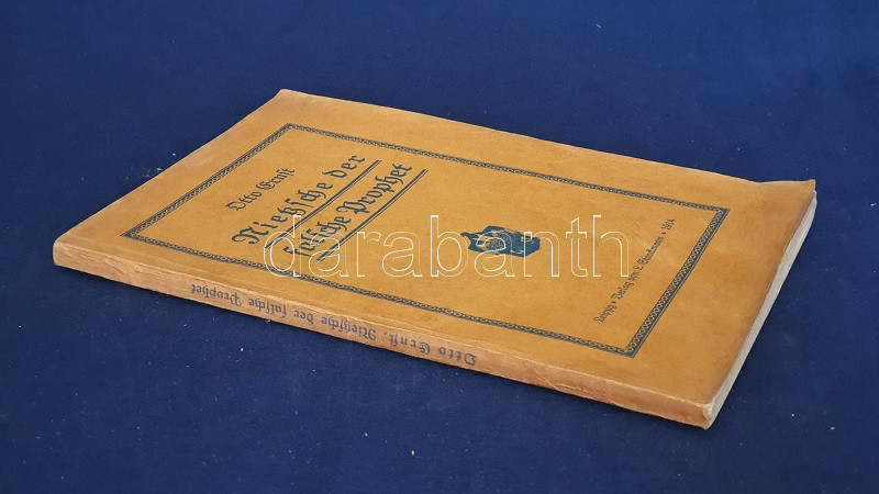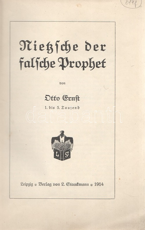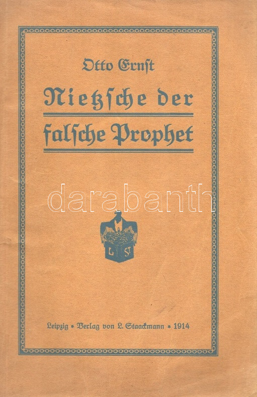 Ernst, Otto: Nietzsche der falsche Prophet. Leipzig, 1914. Verlag von L. Staackmann (Druck: Julius Klinkhardt, Leipzig). IV + 137 + [3] p. Első kiadás. Otto Ernst Schmidt (1862-1926) német költő, író, szerkesztő. A derűs történeteiről ismert hamburgi szerző (és kritikus) e ritkább művében Friedrich Nietzsche morálfilozófiáját veszi kritikai górcső alá, művenkénti bontásban. Gót betűs szövegoldalakkal. Poss.: Ex libris doctoris Emerici Forbáth. [Forbáth Imre (1898-1967) költő, író, újságíró, orvos, a felvidéki magyar irodalom kimagasló alakja.] Fűzve, címfeliratozott kiadói borítóban. Körülvágatlan, szép példány.