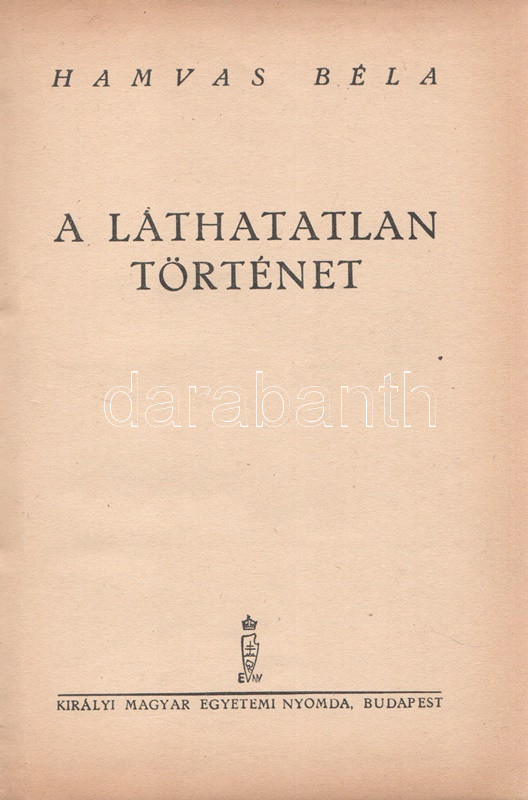Budapest, (1943). Királyi Magyar... https://www.darabanth.com/de/466-Fernauktion/466.0/Bucher/Bucher-Sozialwissenschaften~500026/Hamvas-Bela-A-lathatatlan-tortenet-Budapest-1943-Kiralyi-Magyar-Egyetemi-Nyomda-185-plus-~II3147648
