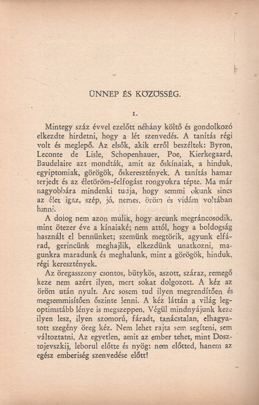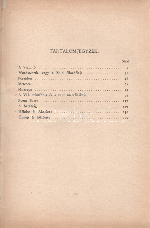 Hamvas Béla (1897-1968) filozófus, esztéta, gondolkodó elsÅ‘ önálló esszékötete, melyben merész képzelettársÃtásokkal és mitikus, olykor történelmi párhuzamokkal elemzi a kultúra örök és válságos jelenségeit.