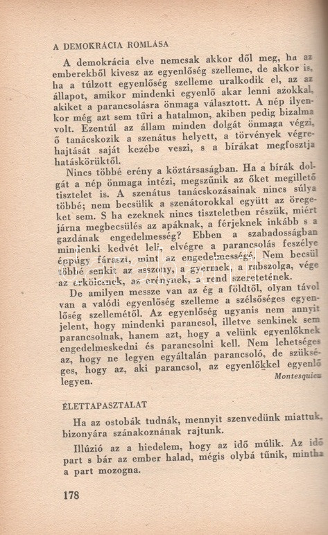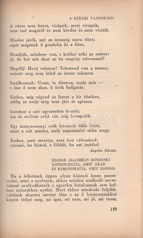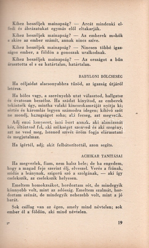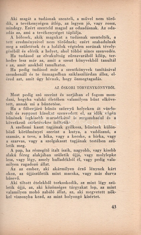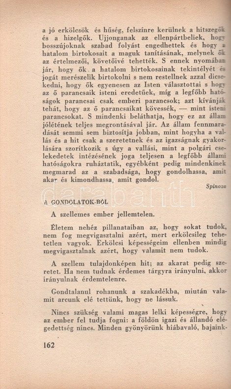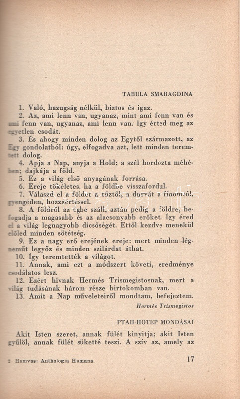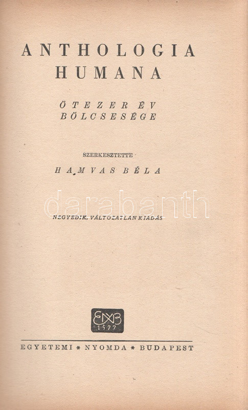Hamvas Béla (szerk.): Anthologia humana. Ötezer év bölcsesége. Szerkesztette Hamvas Béla. Budapest, (1948). Egyetemi Nyomda. 323 + [1] p. A Hamvas Béla, a XX. század egyik legnagyobb magyar gondolkodója által szerkesztett aforizmagyűjtemény (meditációs objektum) első kiadása 1946-ban jelent meg, két év leforgása alatt további három kiadása jelent meg, példányunk a negyedik, változatlan kiadásból való. A keleti bölcsektől, a középkor és az újkor számos neves gondolkodójától származó hosszabb-rövidebb idézetek az emberi lét, együttélés és szabadság lényegét nyomozzák - a Védák könyvétől Szent Bernátig, Pascaltól Nietzschéig, Paracelsustól Dosztojevszkijig ívelő gondolatgyűjtemény a rendszerváltásig nem is jelenhetett meg újra: a kötetben valóban groteszk módon szerepel egymás mellé helyezve szerepel Gandhi és Sztálin gondolatvilága, a szerzőt két év múlva elnémították. Aranyozott gerincű kiadói félvászon kötésben. Jó példány.
