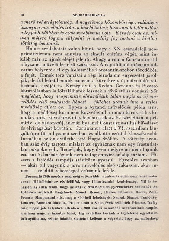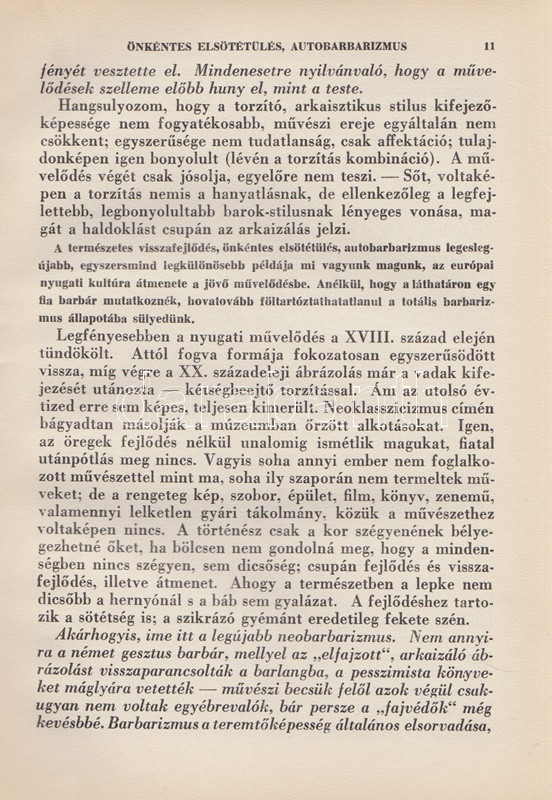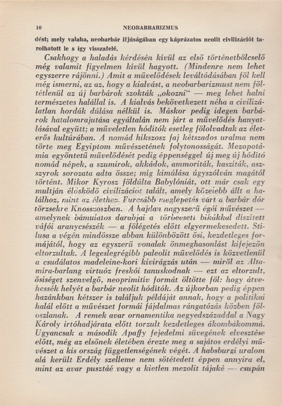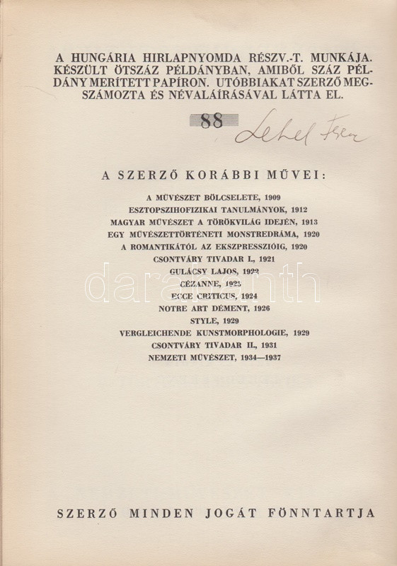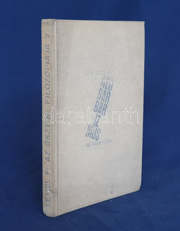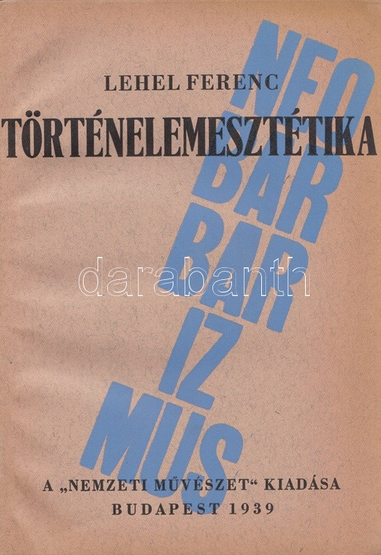 Lehel Ferenc: Neobarbarizmus. Történelemesztétika. (Aláírt, számozott.) Budapest, 1939. A ,,Nemzeti Művészet" kiadása (Hungária Hírlapnyomda Rt.) 100 p. Egyetlen kiadás. Kolofon: ,,Készült ötszáz példányban, amiből száz példány merített papíron. Utóbbiakat szerző megszámozta és névaláírával látta el. 88. [számú példány]. Lehel Ferenc (aláírás). Lehel Ferenc (1885-1975) festőművész, kritikus és művészeti író merész képzelettársításokkal teljes történelemfilozófiai tanulmánya, mely művészettörténeti fogalmakat használ társadalmi jelenségek és korszellemek leírására. A tartalomból: Államművészet - Új népkeveredés, új faj - Vallásos és vallástalan korok - A teológia alkalmazott művészettudomány - Esztétikus fajok és csúnya fajok - A zsidóság nem faj - A nemzetköziség nem hazátlanság - A jövő a germánságé? - Korszellemünk lényege: univerzalizmus - A nácizmus és a bolsevizmus különbsége -A forradalom visszaesés - A demokrácia reakció - Az egyenlőség illúzió - A proletárdiktatúra lázálom. (Az ösztön filozófiája - V. könyv.) Illusztrált kiadói egészvászon kötésben, az eredeti, illusztrált első borító bekötve. Jó példány.
