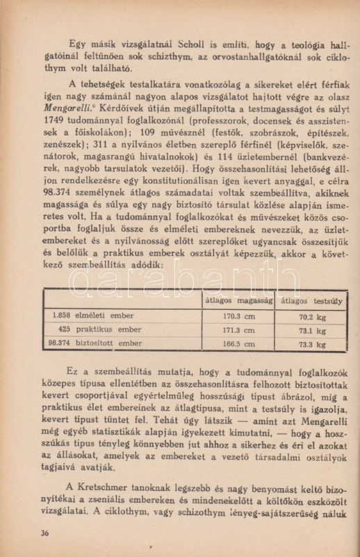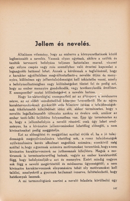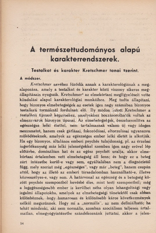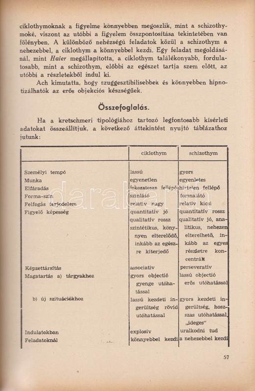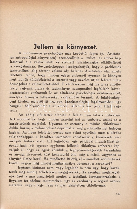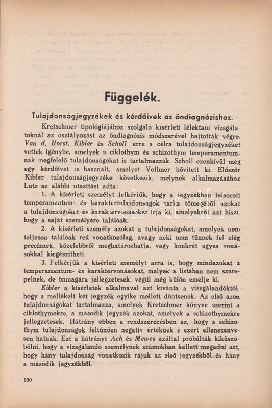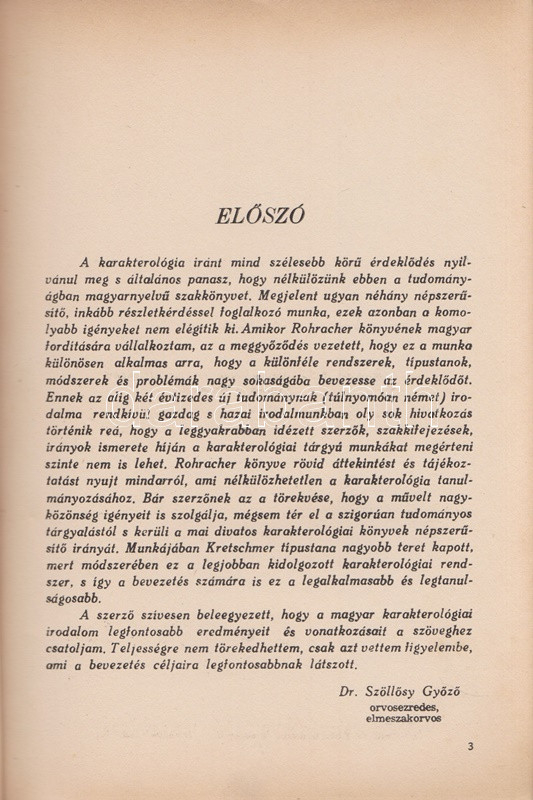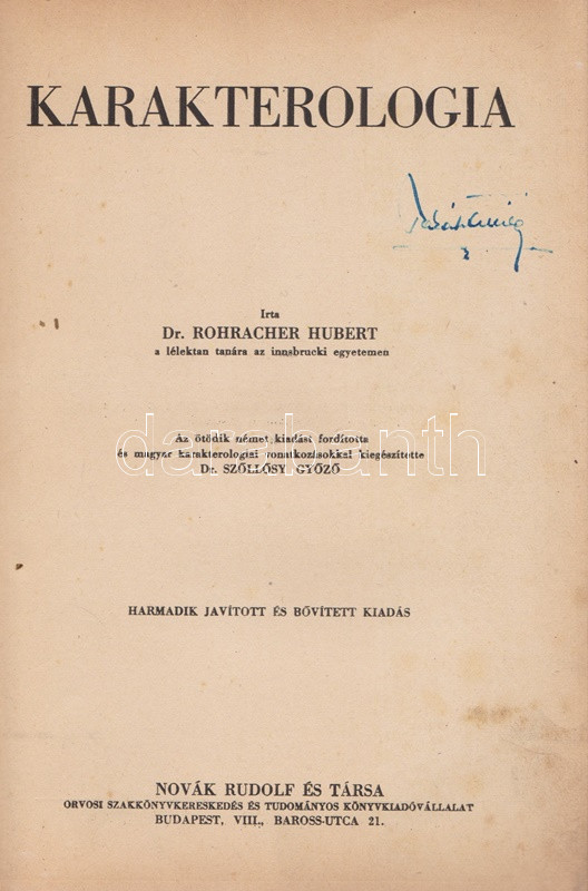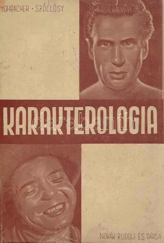 Rohracher, Hubert - Szőllősy Győző: Karakterológia. Az ötödik német kiadást fordította és magyar karakterológiai vonatkozásokkal kiegészített Szőllősy Győző. Budapest, (1942). Novák Rudolf és Társa Orvosi Szakkönyvkereskedés és Tudományos Könyvkiadóvállalat (Gyarmati és Bősz nyomda). 160 p. Hubert Rohracher (1903-1972) osztrák pszichológus, innsbrucki egyetemi tanár személyiség-lélektani kötetének első magyar kiadása 1939-ben jelent meg, példányunk a harmadik, javított és bővített magyar kiadásból való. A munka döntően Ernst Kretschmer és Erich Jaensch tipológiáját ismerteti, kiegészítve Carl Gustav Jung, a magyar tudósok közül pedig Klages Lajos és Noszlopi László elméleteivel. A tartalomból: Testalkat és karakter. - A kísérleti típusdiagnosztika értéke és megbízhatósága. - Jellem és átöröklés. - Karakter és nemiség. - Jellem és környezet. - Jellem és nevelés. - Jellem és sors. - Tulajdonságjegyzékek és kérdőívek az öndiagnózishoz. A címoldalon régi tulajdonosi bejegyzés. Fűzve, illusztrált, enyhén sérült kiadói védőborítóban. Jó példány.