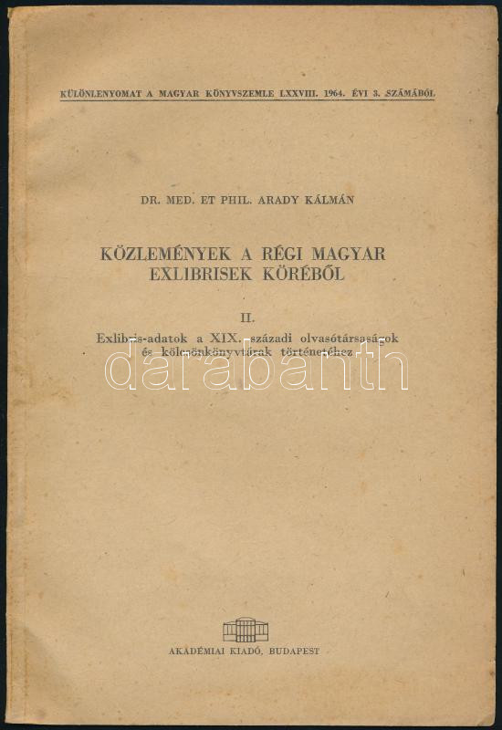 Arady Kálmán: Közlemények a régi magyar ex librisek köréből II. Exlibris-adatok a XIX. századi olvasótársaságok és kölcsönkönyvtárak történetéhez. Különlenyomat a Magyar Könyvszemle LXXVII. 1964. évi 3. számából. Bp., 1964, Akadémiai. 247-253. p. Kiadói papírkötés.