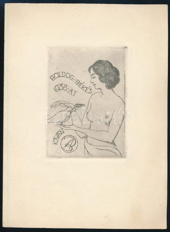 Beschreibung: Bajor Ágost (1892-1958): "Boldog békés 1938-at kíván", erotikus ex libris, rézkarc, papír, 8×6 cm