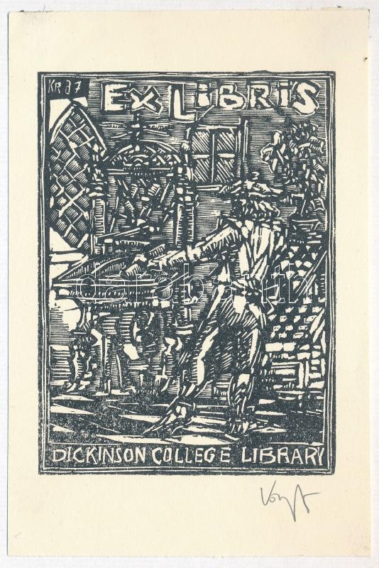 Beschreibung: König (Kőnig) Róbert (1951-2014): Ex libris Dickinson College Library. Klisényomat, papír, jelzett, sarkaiban papírra rögzítve, 10x7,5 cm