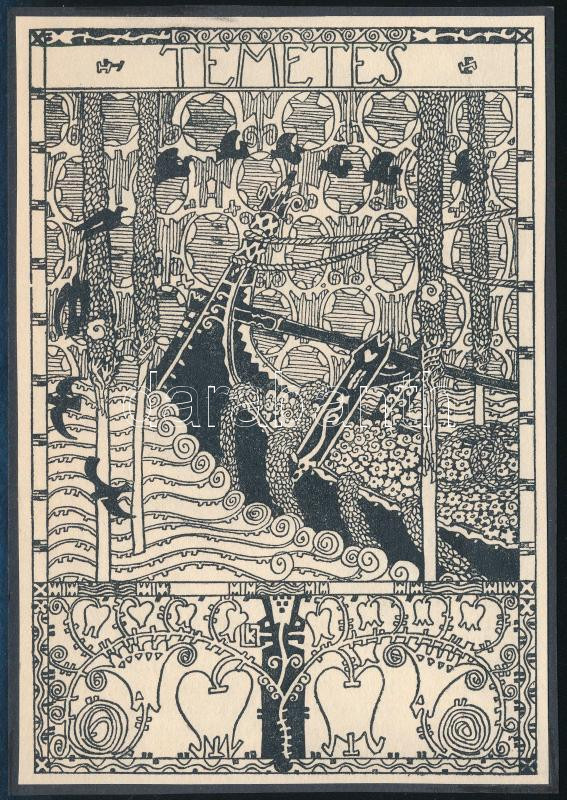 Beschreibung: 1908 Kozma Lajos (1884-1948): "Temetés", klisé, papír, kartonra kasírozva, jelzett a dúcon, 16,5x11 cm