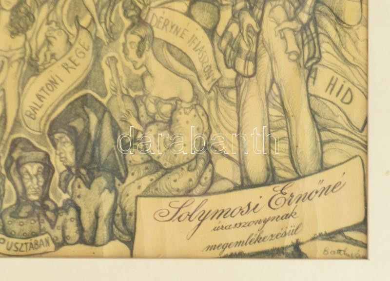 Batthyány Gyula (1887-1959): Herczeg Ferenc 80. éves születésnapja alkalmából készült nagy méretű grafikus emléklap, névre szóló példány. Ofszet, papír, jelzett a nyomaton , üvegezett keretben, 30x46 cm