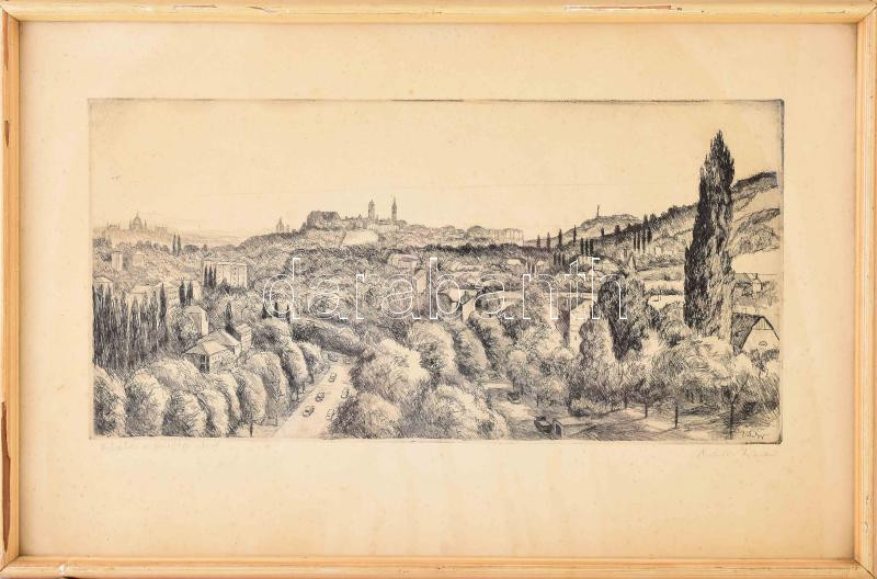 Beschreibung: Zádor István (1882-1963): Kilátás a Kútvölgyi útról. Rézkarc, papír, jelzett, kissé foltos, üvegezett fakeretben, 23x47 cm