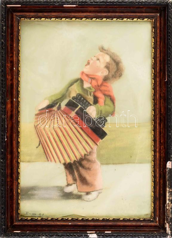 Diosi jelzéssel: Harmonikázó kisfiú. Pasztell, papír. Dekoratív, üvegezett, sérült fakeretben, 42×28 cm