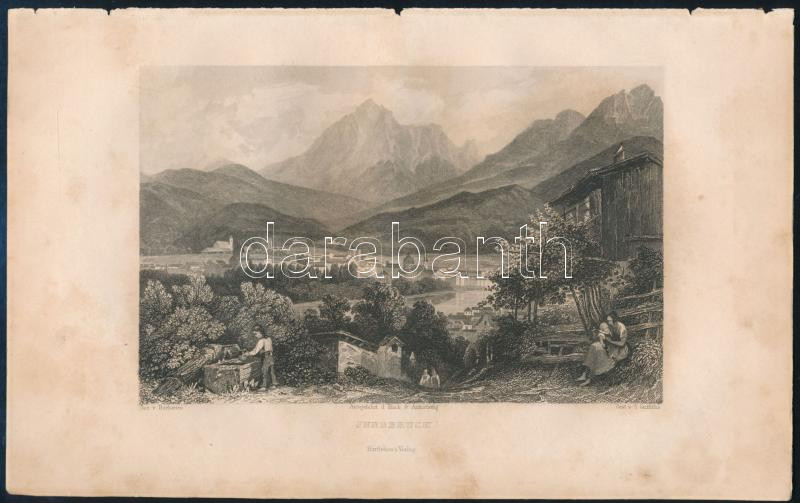 Beschreibung: Innsbruck látképe, acélmetszet, papír, jelzett a metszeten (Barbarini, Griffiths), kissé foltos. 10×15,5 cm