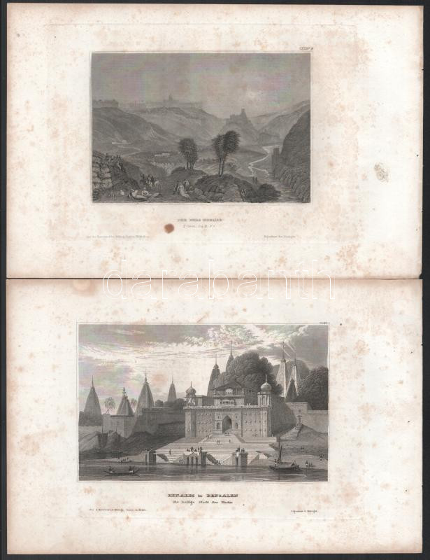 cca 1840 A Móriá-hegy (Templom-hegy) Jeruzsálemben + Benáresz (ma Váránaszi), a hindu vallás szent városa. 2 db acélmetszet, papír, jelzettek a metszeten, foltos lapok, lapméret: 18x27,5 cm