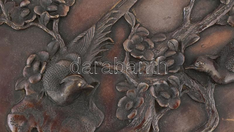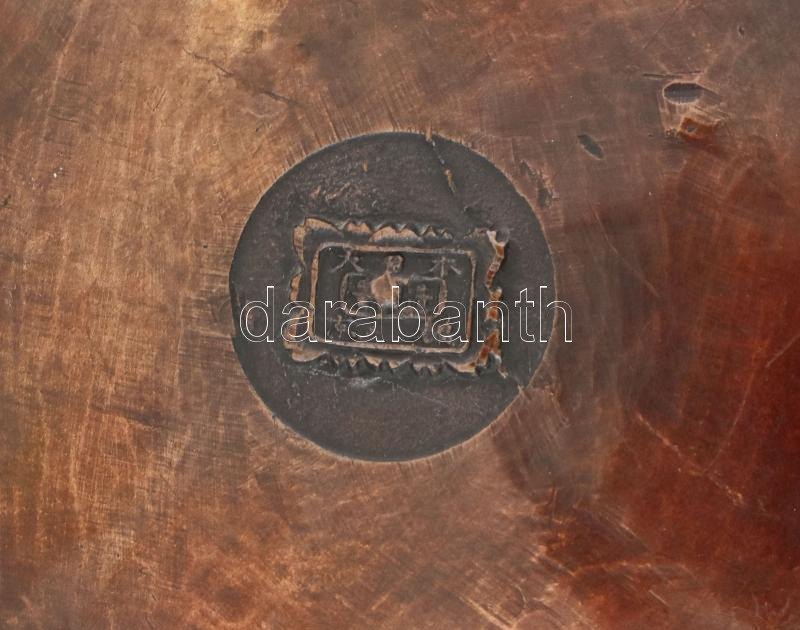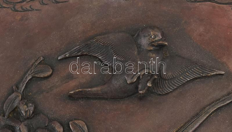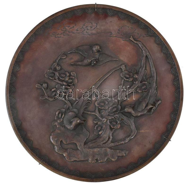 Antik japán madármintás bronz falitál, klasszikus japán domború madárábrázolással ékesített nagy méretű bronz falidísz, hátoldalán anyagba faragott pecséttel jelezve. Kis kopottsággal, d: 36,5 cm
