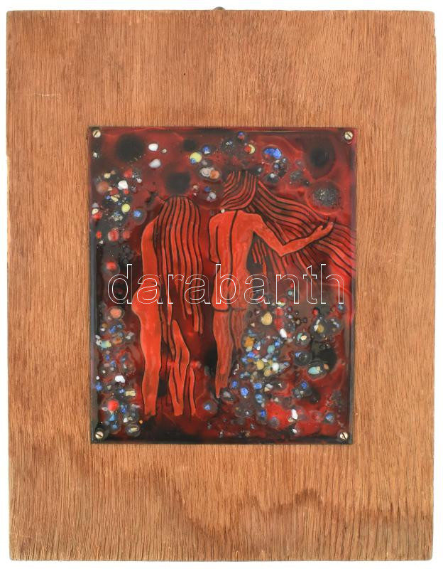 Beschreibung: Vén Edit (1937-): Lánypár. Zománckép, fa lapra applikálva, jelzés nélkül, 17,5x15 cm