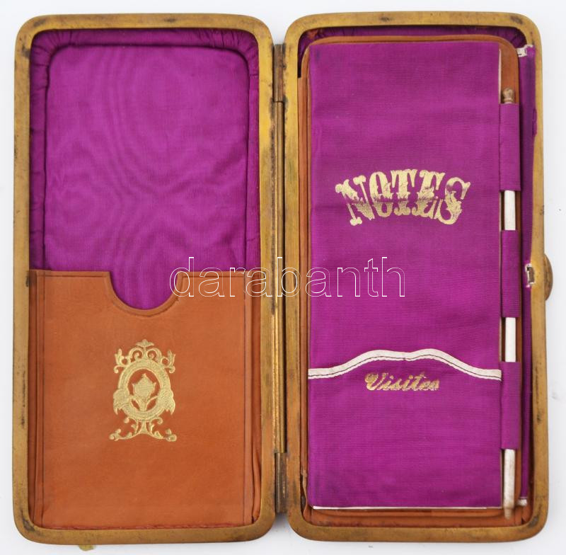 cca 1865 Utazó notesz. Bőr, selyem, aranyozott, csont írópálcával. jegyzettömbbel, egy kis dátumozott bejegyzéssel. gobelines és bőr borítással, nagyon szép állapotban. 8x16 cm