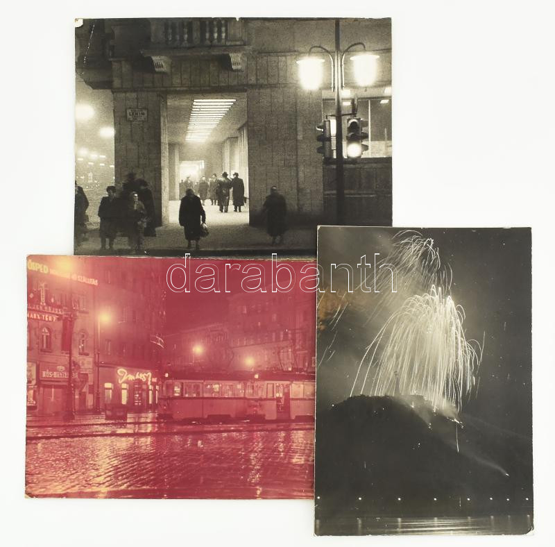 Vágány László fotós, légifényképész felvételei Budapestről: Lenin körút (Erzsébet körút), villamos a Marx tér (Nyugati tér) 7. előtt, tűzijáték a Gellért-hegyen, 3 db kartonra kasírozott fotó, 22,5x16 cm és 23,5x17,5 cm között