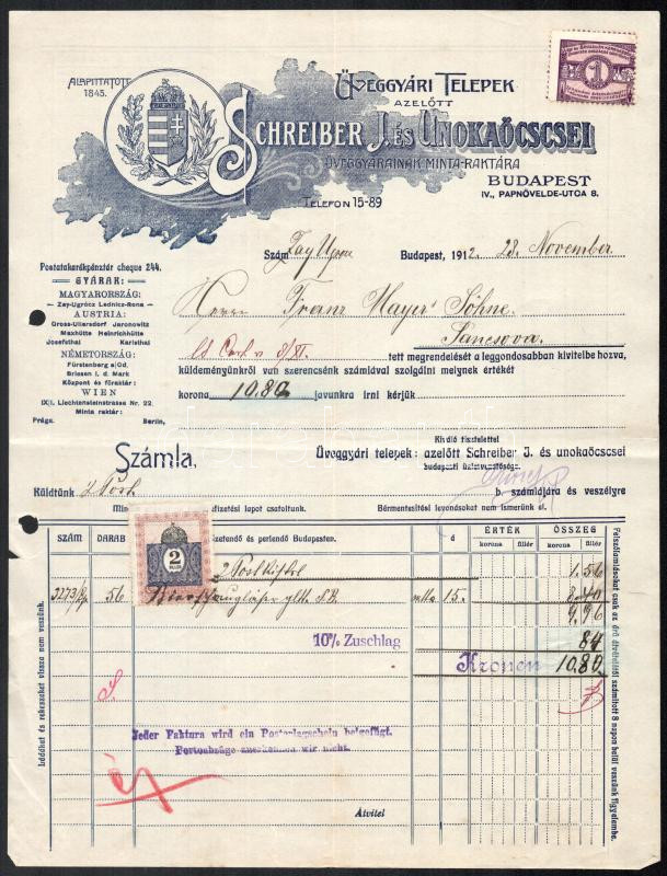 1912 Bp., Schreiber J. és Unokaöccsei üveggyárának mintaraktára fejléc... https://www.darabanth.com/de/466-Fernauktion/466.0/Kunst-Dokumente-andere-Sammelgebiete/Dokument~20/1912-Bp-Schreiber-J-es-Unokaoccsei-uveggyaranak-mintaraktara-fejleces-szamla~II3149726