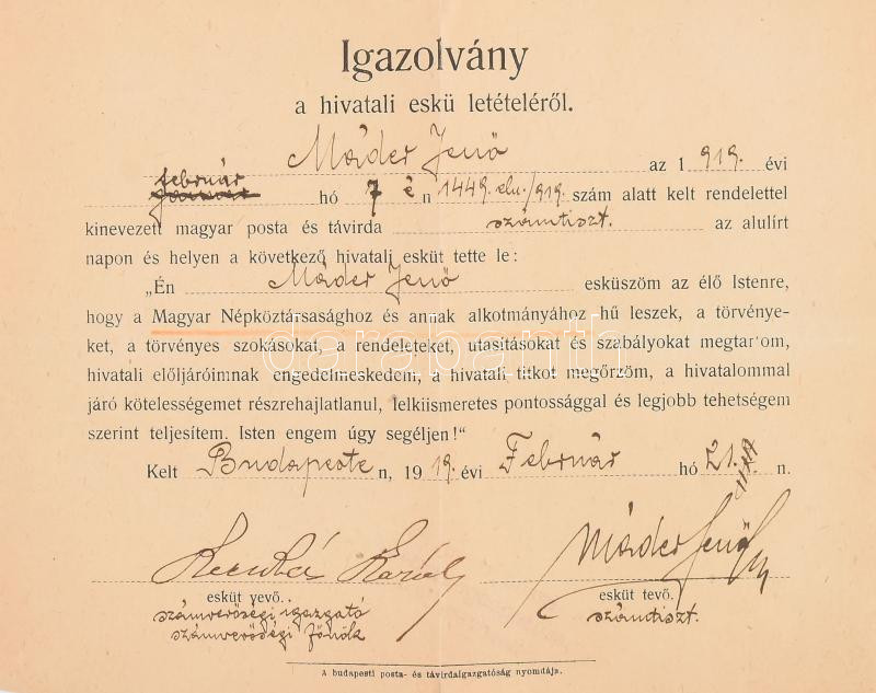 Beschreibung: 1919. február 21. Igazolvány a hivatali eskü letételéről Magyar Népköztársaságra