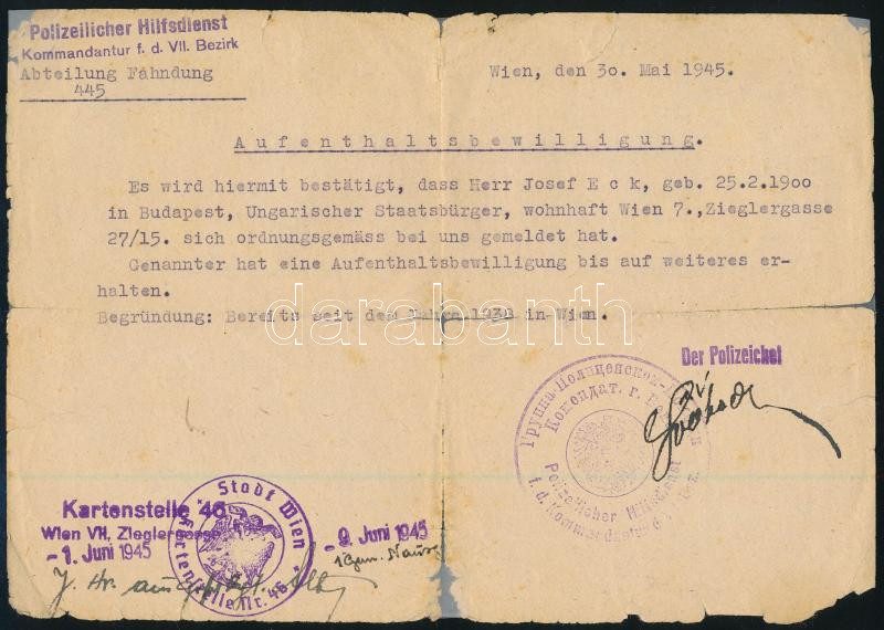1945 Bécs, tartózkodási engedély magyar állampolgár részére orosz és n... https://www.darabanth.com/de/466-Fernauktion/466.0/Kunst-Dokumente-andere-Sammelgebiete/Dokument~20/1945-Becs-tartozkodasi-engedely-magyar-allampolgar-reszere-orosz-es-nemet-nyelvu-pecset~II3144056