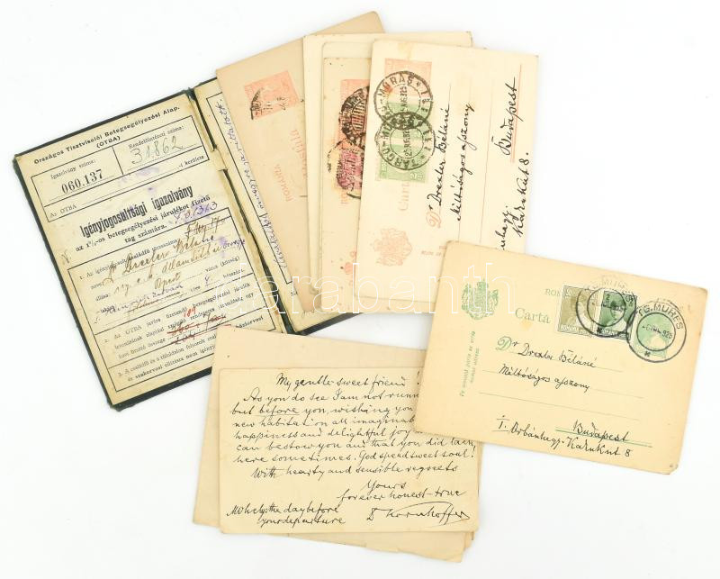 Beschreibung: 1948 Bp., Drexler Béla Dezső Vilmos, Drexler Béla miniszteri titkár fiának születési anyakönyvi kivonata 6+3Ft illetékbélyeggel, kisebb szakadásokkal + Drexler Bélánénak címzett, angol nyelven megírt levelezőlap, Marosvásárhelyről Budapestre küldve + hozzá 8 db levelezőlap, OTBA igazolvány,