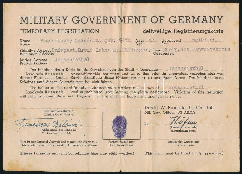 cca 1945 Németország amerikai katonai kormányzata által kibocsátott ideiglenes nyilvántartás (igazolvány) magyar személy részére, Johannisthal (Kronach)