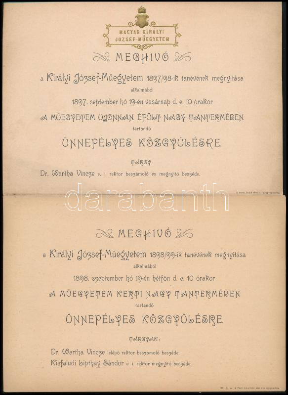 1897-98 A Királyi József Műegyetem tanévének megnyitására szóló két dí... https://www.darabanth.com/de/466-Fernauktion/466.0/Kunst-Dokumente-andere-Sammelgebiete/Drucksachen~500013/1897-98-A-Kiralyi-Jozsef-Muegyetem-tanevenek-megnyitasara-szolo-ket-diszes-meghivo~II3147222