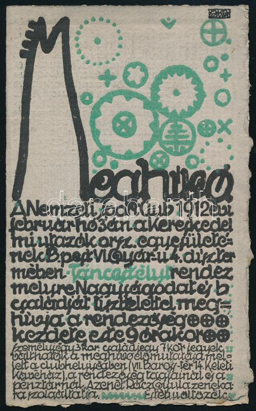 1912 Meghívó Nemzeti Sport Club táncestélyére, fametszet, papír, 16x10... https://www.darabanth.com/de/466-Fernauktion/466.0/Kunst-Dokumente-andere-Sammelgebiete/Drucksachen~500013/1912-Meghivo-Nemzeti-Sport-Club-tancestelyere-fametszet-papir-16x10-cm~II3148618