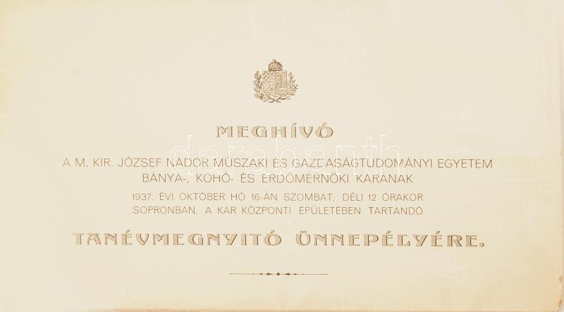 1937 Sopron, meghívó a M. Kir. József Nádor Műszaki és Gazdaságtudományi Egyetem Bánya-, Kohó- és Erdőmérnöki Karának tanévnyitó ünnepélyére, gr. Teleki Pál beszédével, hajtott