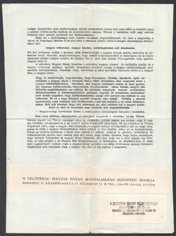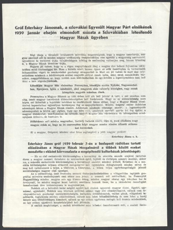 1939 Gróf Esterházy Jánosnak, a szlovákiai Egyesült Magyar Párt elnökének 1939 január elsején elmondott szózata a Szlovákiában létesítendő Magyar Házak ügyében. 2 p.