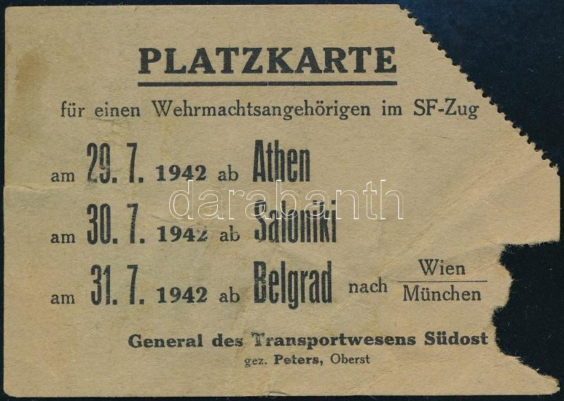 1942 Wehrmacht katona utazási jegye Athénból Belgrádba. https://www.darabanth.com/de/466-Fernauktion/466.0/Kunst-Dokumente-andere-Sammelgebiete/Drucksachen~500013/1942-Wehrmacht-katona-utazasi-jegye-Athenbol-Belgradba~II3083246
