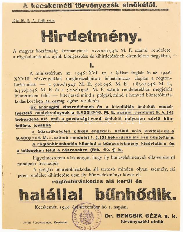 1946 Kecskeméti törvényszék hirdetménye rögtönbíráskodásról az árdrágí... https://www.darabanth.com/de/466-Fernauktion/466.0/Kunst-Dokumente-andere-Sammelgebiete/Drucksachen~500013/1946-Kecskemeti-torvenyszek-hirdetmenye-rogtonbiraskodasrol-az-ardragitas-esteben-20x28-cm~II3145929