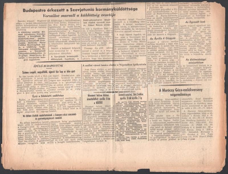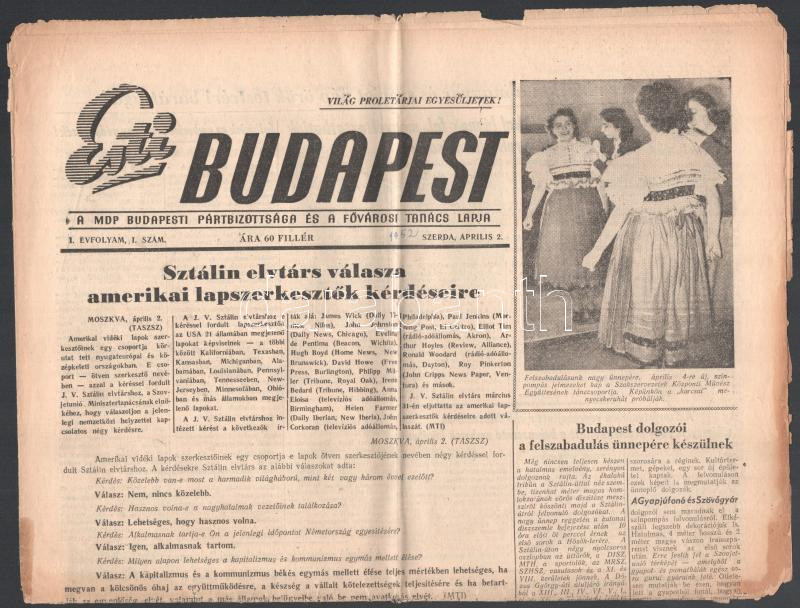 1952 Esti Budapest I. évf. 1. szám. 1952. április. 2. A MDP Budapesti Pártbizottsága és a Fővárosi Tanács lapja. Főszerk.: Bíró László. [Bp.], Budapesti Lapkiadó Vállalat, szakadt, hajtott, 6 p. "A Világosság utódlapjaként jelent meg az Esti Budapest első száma 1952. április 2-án, szerdán. Ez volt az első szocialista bulvárlap, az MDP budapesti pártbizottsága és a fővárosi tanács közös felügyelete alatt. Hangvétele hasonló volt a többi korabeli újsághoz, szemmel látható különbséget csak a cikkek rövidsége mutatott. A lap 1956-ban Esti Budapest néven megszünt. 1956. november 2-án, utódja az Esti Hírlap." https://mediatortenet.wordpress.com/2014/11/30/esti-budapest-1952-1956/