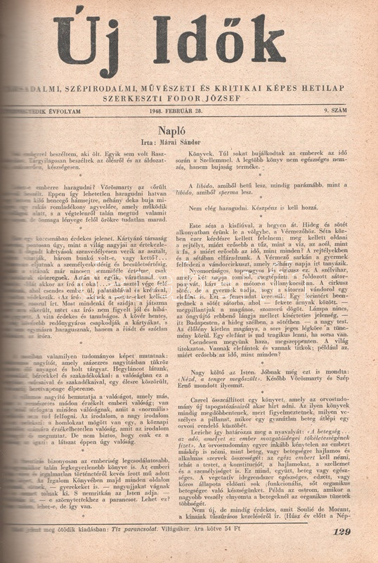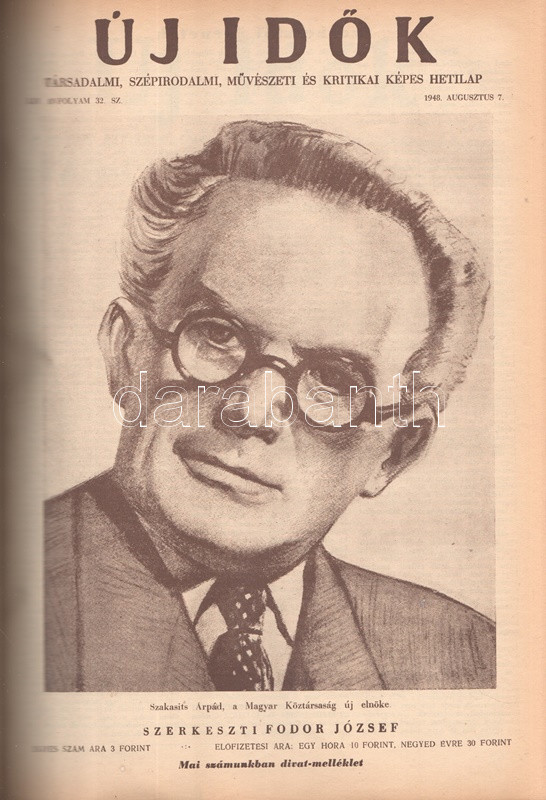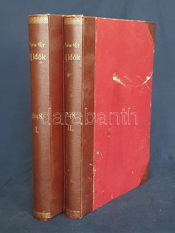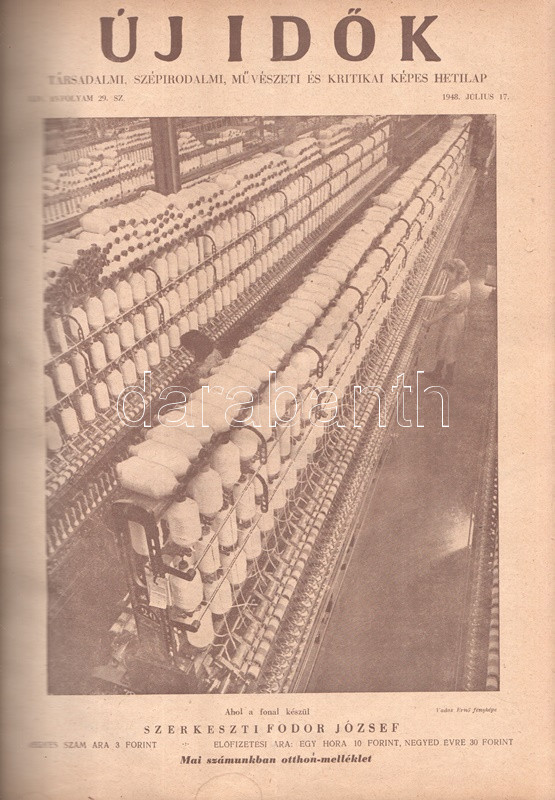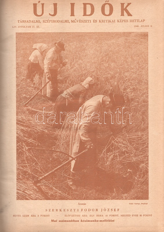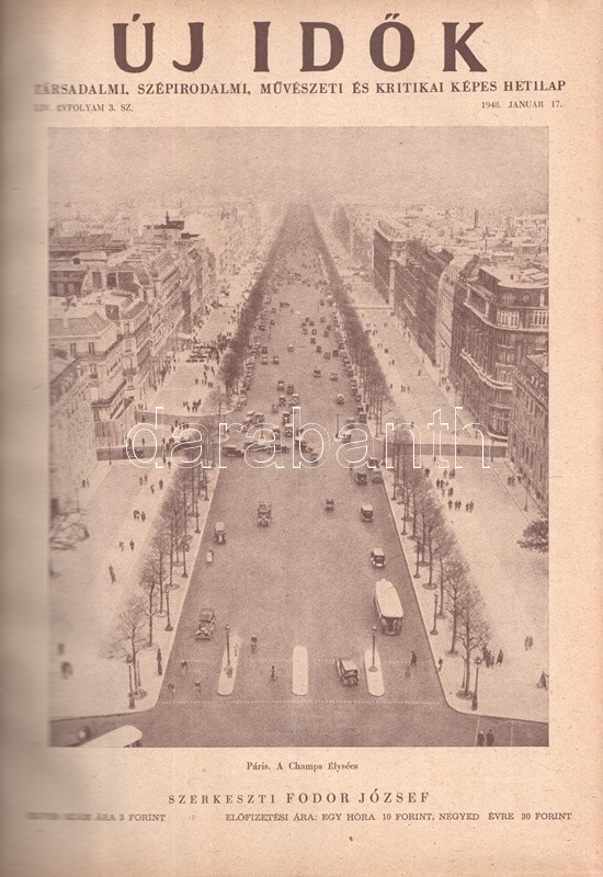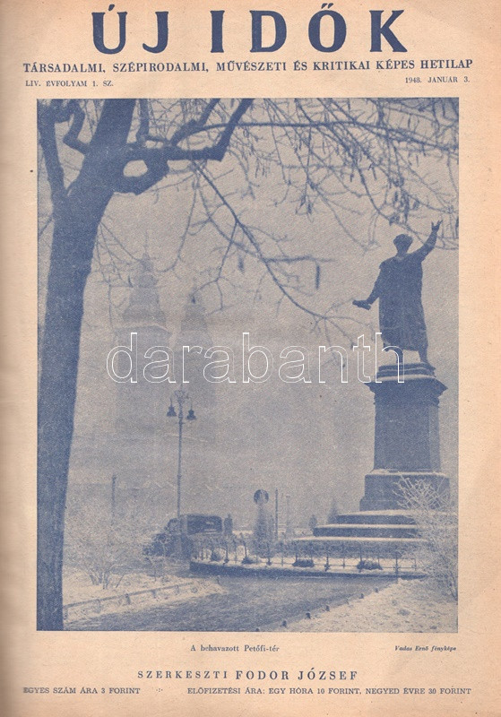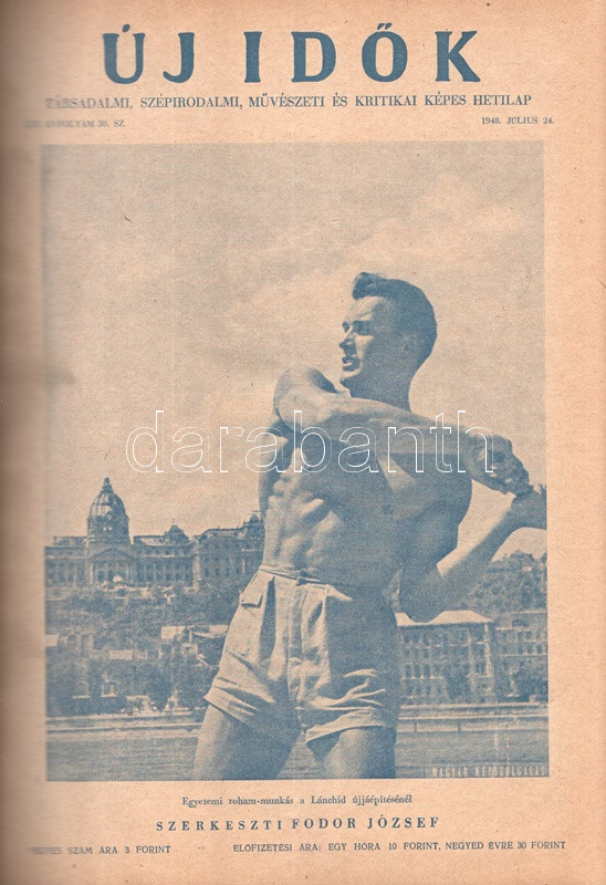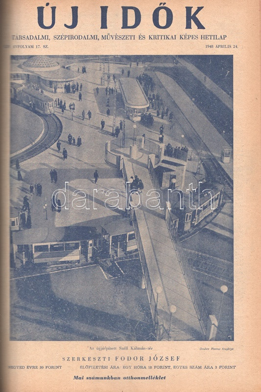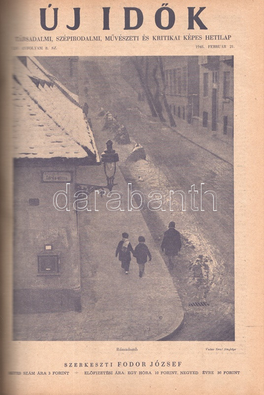 Új Idők. Társadalmi, szépirodalmi, művészeti és kritikai képes hetilap. Felelős szerkesztő: Fodor József. LIV. évfolyam, 1-52. szám. (1948. január 3. - 1948. december 25.) [Teljes évfolyam, két kötetbe kötve.] Budapest, 1948. Szikra Irodalmi és Lapkiadó Vállalat. 444 p.; 445-460 + 1-408 p. A nagy múltú képes szépirodalmi, művészeti, kritikai és társasági hetilap, az Uj Idők a Singer és Wolfner kiadó jelentős vállalkozása volt, főszerkesztésével a frissen befutott írót, Herczeg Ferencet bízták meg. Az író a lap 1894-től 1944-ig szerkesztette a lapot. Az úri középosztály képes magazinjaként elkönyvelt periodika elsősorban hazai irodalmi anyagot közölt, novellákat, regényfolytatásokat, irodalmi, színházi, zenei és művészeti kritikákat, illetve divatmelléklettel is szolgált. A jobbára politikamentes hetilap 1919 nyarán, illetve 1944 decemberétől 1945 augusztusáig szünetelt, ez utóbbi újrainduláskor a lapot fémjelző Herczeg Ferenc kikerült a szerkesztőségből, 1945. augusztus 4-i újrainduláskor Benedek Marcellt, a jeles közírót tették meg főszerkesztőnek, majd leköszönésével Fodor József látta el a szerkesztői feladatokat. Az újraindult Új Idők továbbra is elsősorban irodalmi anyagot hozott, 1948. évi évfolyama Fekete István ,,Végtelen út" című regényét, illetve Aranyossi Magda ,,Öt kisasszony egy udvarházban" című lektűrjét. Valamennyi lapszám egész oldalas felvétellel illusztrált fedőborítóval indul, magyar és külföldi városok és turisztikai vidékek látképeivel, zsánerfotókkal, budapesti utcaképekkel; aratás idején aratási fotókkal, a nyári szezon esetében balatoni zsánerképekkel, ám az év folyamán - s változó idők jeleként - egyre gyakrabban jelennek meg az első borítón munkás jelenetek, sőt élmunkás fotók is, a belív felvételei között pedig az év második felétől egyre gyakrabban tűnnek fel hídavatási fotók, politikusportrék, imperializmus elleni gyűlésekről közzétett felvételek. Szakasits Árpád köztársasági elnök portréjának fedőborítón való közzététele már önmagában is különös a hagyományosan politikamentes lapban, ám később Zsdanov elvtárs fotója már tendenciát jelez, melyet a kultúrkomisszár Révai József elvtárs ötvenedik születésnapja alkalmából közölt fotója csak erősít, Gerő Ernő és Gerő Ernőné portréjának feltűnése pedig az év végére talán már megszokottnak mondható. Ezzel párhuzamosan a lap belívét illusztráló képanyagban megtöbbszöröződik a korábban alig jellemző szovjet vonatkozású anyag, a humor rovatban pedig feltűnik a Ludas Matyi kommunista élclapban munkálkodó Tabi László több írása is, a mellékesnek tűnő hírrovatokban: a filmes, ismeretterjesztő és társasági hírekben kezdenek megjelenni a markánsan szovjet témájú bejegyzések, illetve imperializmus elleni kirohanások. Az 1948. év során a lapba mind inkább beszivárgó politika ugyanakkor a folyóirat hagyományos rovatait kevéssé érinti, a két világháború közti időszak befutott írói továbbra is közzéteszik írásaikat: Tersánszky Józsi Jenő, Szép Ernő, Kárpáti Aurél, Csathó Kálmán, Kosáryné Réz Lola novellákkal jelentkezik, az új tehetségek között Szobotka Tibor, Mándy Iván is közzéteszi írásait, és habár nagyon is beszédes Márai Sándor Naplóbejegyzéseinek megszűnése az év közepe táján (Márai 1948 augusztusában végleg távozik az országból), a képzőművészeti rovatot továbbra is Lyka Károly, a ,,Köznapi krónika" című közírói rovatot továbbra is Török Sándor jegyzi, a lapszámok tömör szövegblokkjait feloldó, rendkívül korjellemző fejlécrajzokat, a kortárs társadalmi jelenségekről hírt adó, politikamentes karikatúrákat pedig Szecskó Tamás grafikusművész. Emlékezetes kordokumentum a koalíciós idők záró évéről. Egységes, aranyozott gerincű korabeli félvászon kötésben, márványmintás festésű lapszélekkel. Jó példány.