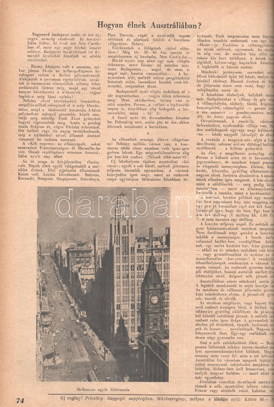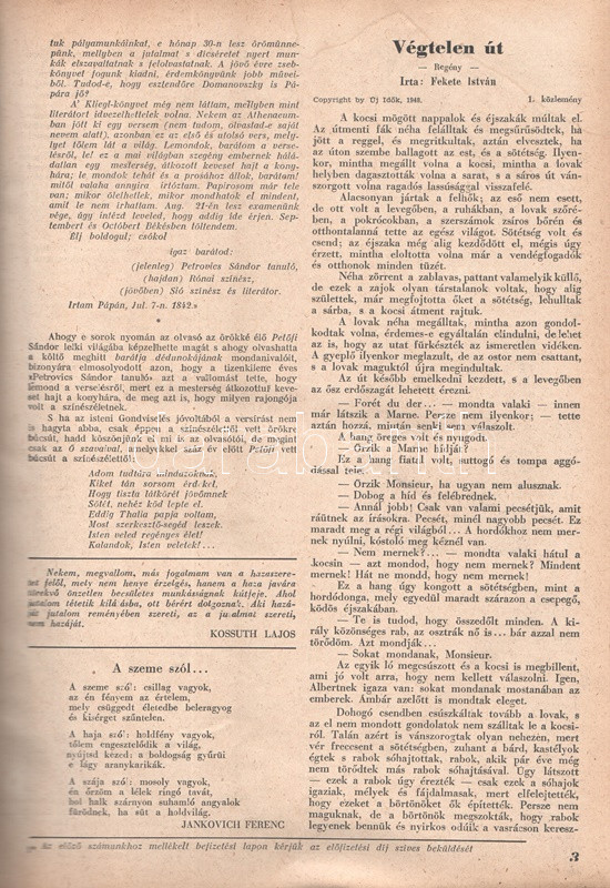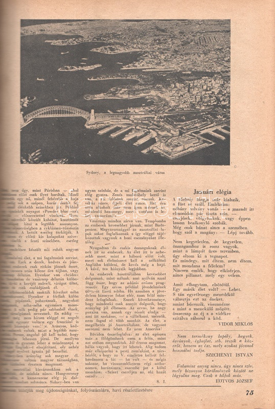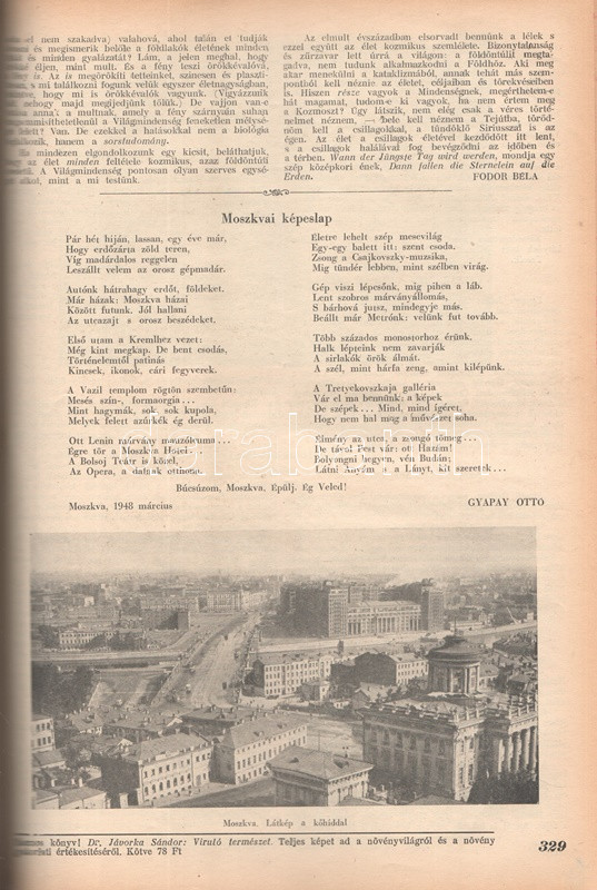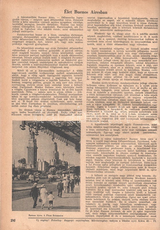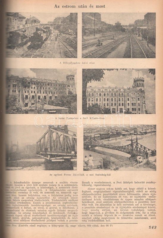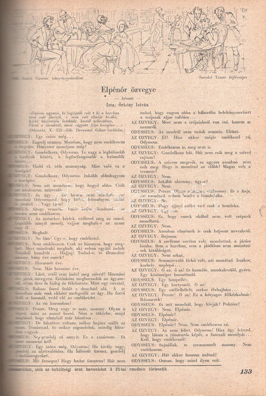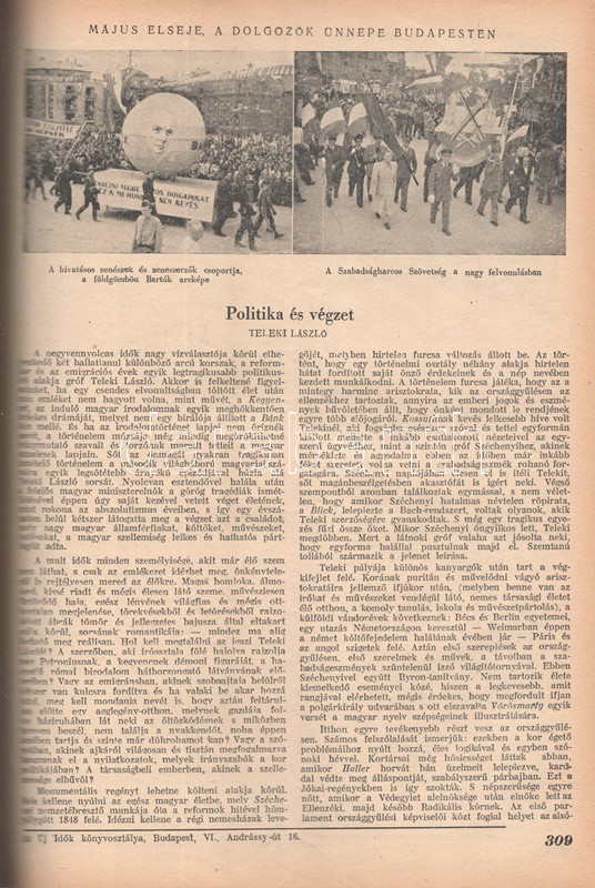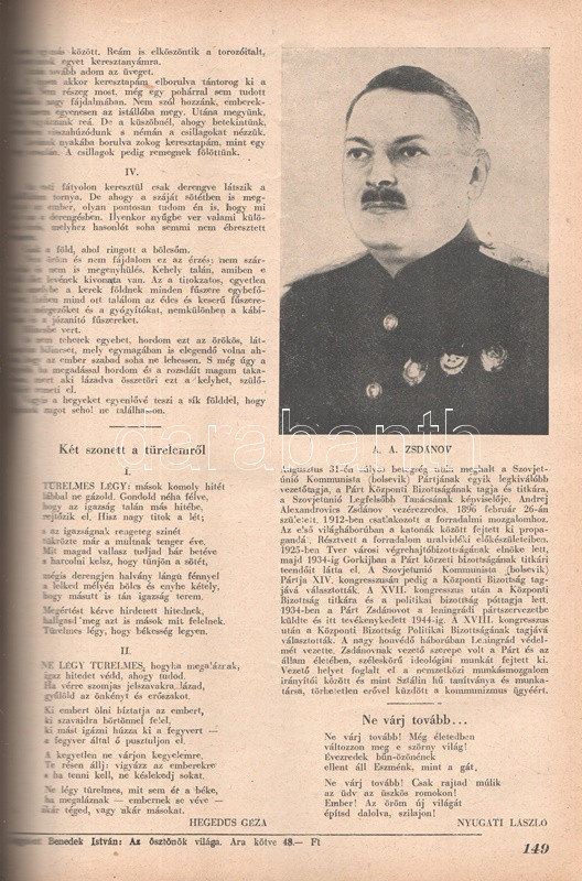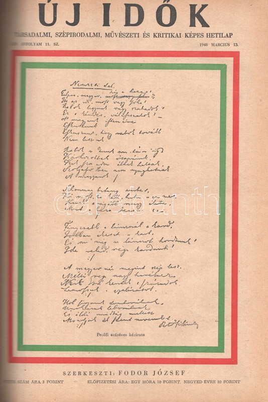 Új Idők. Társadalmi, szépirodalmi, művészeti és kritikai képes hetilap. Felelős szerkesztő: Fodor József. LIV. évfolyam, 1-52. szám. (1948. január 3. - 1948. december 25.) [Teljes évfolyam, két kötetbe kötve.] Budapest, 1948. Szikra Irodalmi és Lapkiadó Vállalat. 444 p.; 445-460 + 1-408 p. A nagy múltú képes szépirodalmi, művészeti, kritikai és társasági hetilap, az Uj Idők a Singer és Wolfner kiadó jelentős vállalkozása volt, főszerkesztésével a frissen befutott írót, Herczeg Ferencet bízták meg. Az író a lap 1894-től 1944-ig szerkesztette a lapot. Az úri középosztály képes magazinjaként elkönyvelt periodika elsősorban hazai irodalmi anyagot közölt, novellákat, regényfolytatásokat, irodalmi, színházi, zenei és művészeti kritikákat, illetve divatmelléklettel is szolgált. A jobbára politikamentes hetilap 1919 nyarán, illetve 1944 decemberétől 1945 augusztusáig szünetelt, ez utóbbi újrainduláskor a lapot fémjelző Herczeg Ferenc kikerült a szerkesztőségből, 1945. augusztus 4-i újrainduláskor Benedek Marcellt, a jeles közírót tették meg főszerkesztőnek, majd leköszönésével Fodor József látta el a szerkesztői feladatokat. Az újraindult Új Idők továbbra is elsősorban irodalmi anyagot hozott, 1948. évi évfolyama Fekete István ,,Végtelen út" című regényét, illetve Aranyossi Magda ,,Öt kisasszony egy udvarházban" című lektűrjét. Valamennyi lapszám egész oldalas felvétellel illusztrált fedőborítóval indul, magyar és külföldi városok és turisztikai vidékek látképeivel, zsánerfotókkal, budapesti utcaképekkel; aratás idején aratási fotókkal, a nyári szezon esetében balatoni zsánerképekkel, ám az év folyamán - s változó idők jeleként - egyre gyakrabban jelennek meg az első borítón munkás jelenetek, sőt élmunkás fotók is, a belív felvételei között pedig az év második felétől egyre gyakrabban tűnnek fel hídavatási fotók, politikusportrék, imperializmus elleni gyűlésekről közzétett felvételek. Szakasits Árpád köztársasági elnök portréjának fedőborítón való közzététele már önmagában is különös a hagyományosan politikamentes lapban, ám később Zsdanov elvtárs fotója már tendenciát jelez, melyet a kultúrkomisszár Révai József elvtárs ötvenedik születésnapja alkalmából közölt fotója csak erősít, Gerő Ernő és Gerő Ernőné portréjának feltűnése pedig az év végére talán már megszokottnak mondható. Ezzel párhuzamosan a lap belívét illusztráló képanyagban megtöbbszöröződik a korábban alig jellemző szovjet vonatkozású anyag, a humor rovatban pedig feltűnik a Ludas Matyi kommunista élclapban munkálkodó Tabi László több írása is, a mellékesnek tűnő hírrovatokban: a filmes, ismeretterjesztő és társasági hírekben kezdenek megjelenni a markánsan szovjet témájú bejegyzések, illetve imperializmus elleni kirohanások. Az 1948. év során a lapba mind inkább beszivárgó politika ugyanakkor a folyóirat hagyományos rovatait kevéssé érinti, a két világháború közti időszak befutott írói továbbra is közzéteszik írásaikat: Tersánszky Józsi Jenő, Szép Ernő, Kárpáti Aurél, Csathó Kálmán, Kosáryné Réz Lola novellákkal jelentkezik, az új tehetségek között Szobotka Tibor, Mándy Iván is közzéteszi írásait, és habár nagyon is beszédes Márai Sándor Naplóbejegyzéseinek megszűnése az év közepe táján (Márai 1948 augusztusában végleg távozik az országból), a képzőművészeti rovatot továbbra is Lyka Károly, a ,,Köznapi krónika" című közírói rovatot továbbra is Török Sándor jegyzi, a lapszámok tömör szövegblokkjait feloldó, rendkívül korjellemző fejlécrajzokat, a kortárs társadalmi jelenségekről hírt adó, politikamentes karikatúrákat pedig Szecskó Tamás grafikusművész. Emlékezetes kordokumentum a koalíciós idők záró évéről. Egységes, aranyozott gerincű korabeli félvászon kötésben, márványmintás festésű lapszélekkel. Jó példány.