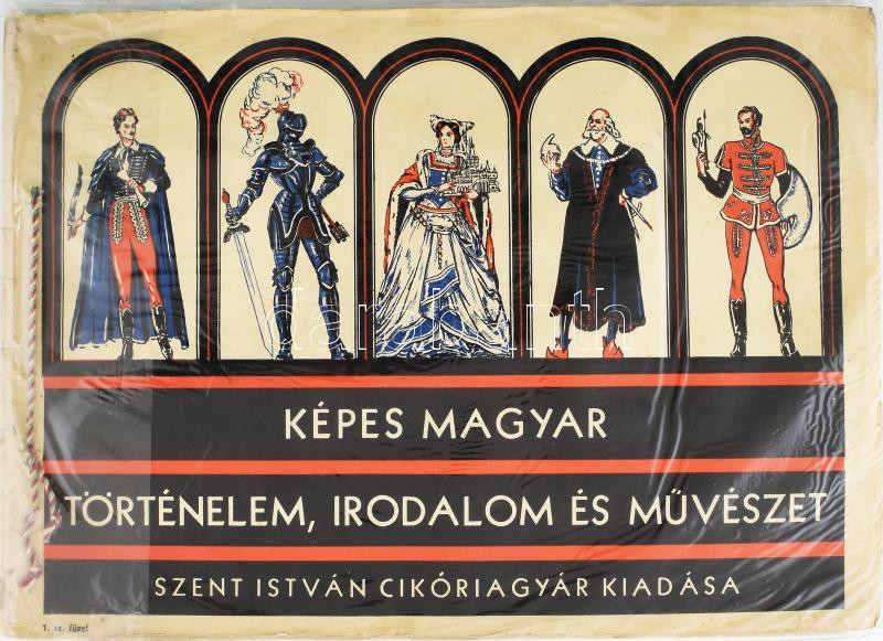 cca 1930-1940 Képes magyar történelem, irodalom és művészet, a Szent István Cikóriagyár gyűjtőalbuma (1. sz. füzet), teljes tartalommal, nemzetiszínű zsinórral fűzve jó állapotban