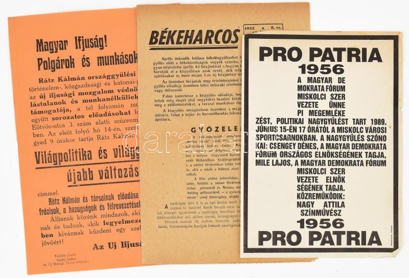 cca 1935-1989 3 db politikai röplap: Rátz Kálmán Világpolitika és világgazdaság újabb változásai c. előadása; Békeharcos - Az áprilisi békekisgyűlések előadóinak; MDF Pro Patria 1956 megemlékezés és nagygyűlés